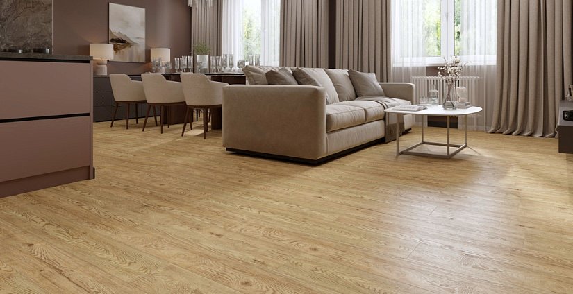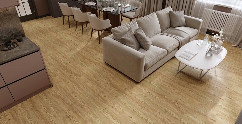 Дуб Золотистый Grand Sequoia — тёплый золотистый оттенок в премиум-исполнении. Толщина 5 мм и защитный слой 0,5 мм обеспечивают максимальную износостойкость. Роскошный декор для гостиных и кабинетов.
