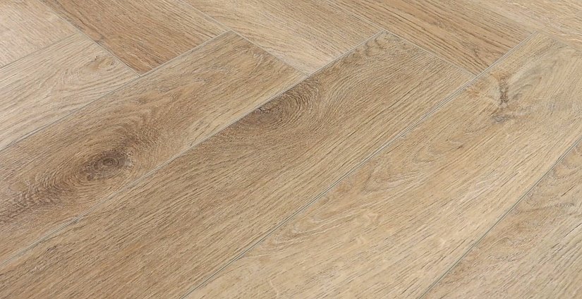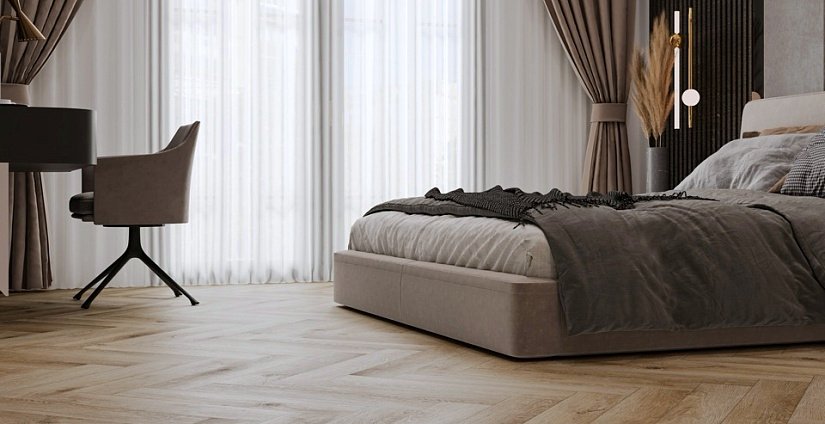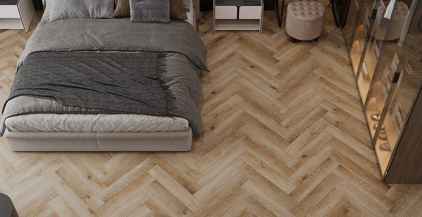 Дуб Монпелье в раскладке ёлочкой — медовый тёплый декор с благородной классической текстурой.