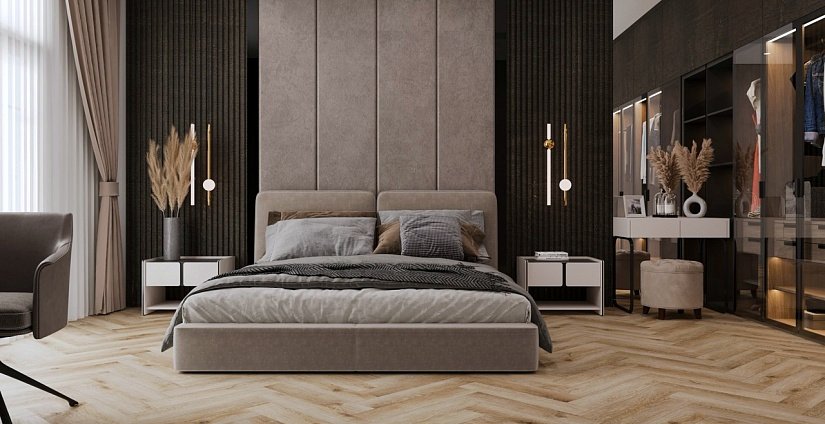 Дуб Монпелье в раскладке ёлочкой — медовый тёплый декор с благородной классической текстурой. Классика, которая никогда не выходит из моды. Для гостиных, столовых и парадных интерьеров.