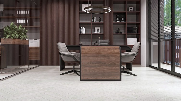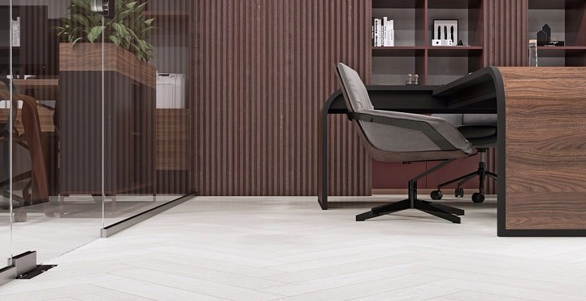 Дуб Нант в раскладке ёлочкой — выразительный тёмно-коричневый декор. Благородный и статусный, подходит для кабинетов, гостиных и ресторанных интерьеров. Контрастно смотрится со светлыми стенами.